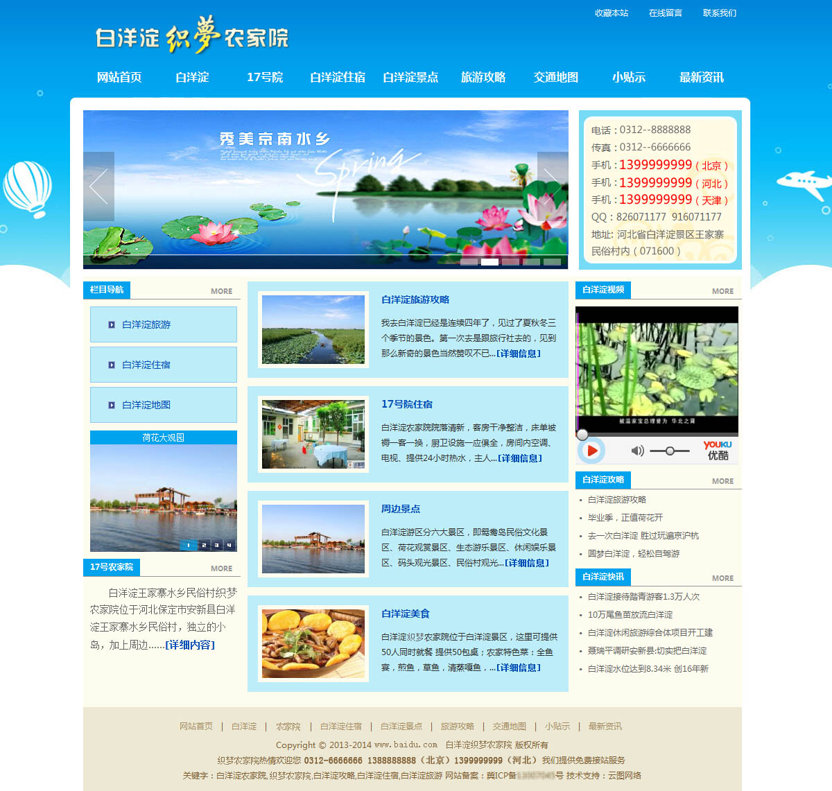 本模板色调:仿百度旅游风格,主色调为蓝色,辅助色为米黄色,简洁自然清新。适用于旅游、旅行社、环保公司、客栈酒店、农家院、农家乐,以及各类公司企业。