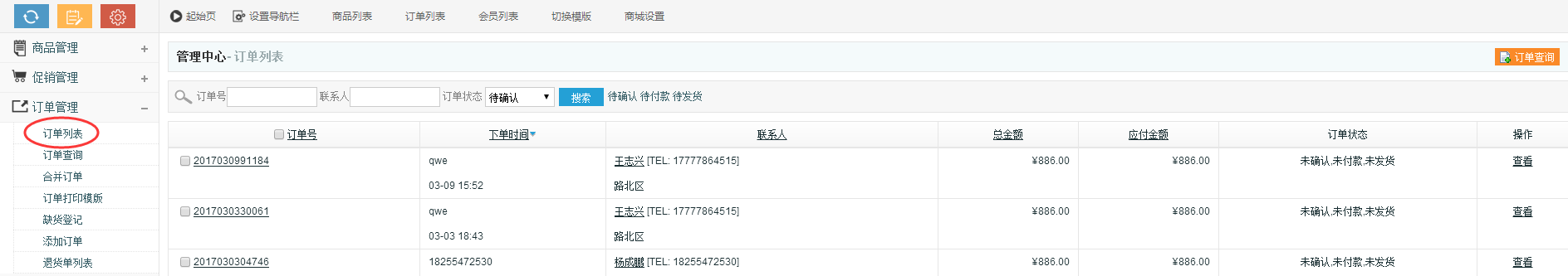 二、订单列表——订单列表里主要显示订单号、下单时间、联系人信息、订单总金额、应付金额、订单状态。