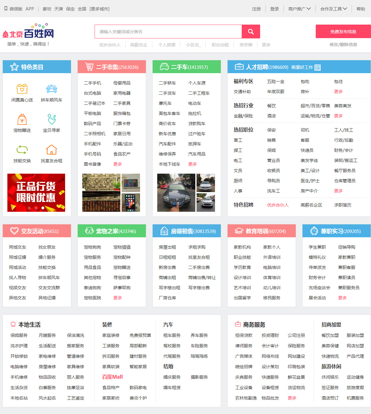 百姓网 (Baixing.com)成立于2005年3月1日,是国内第一家分类信息网【查看详情】
