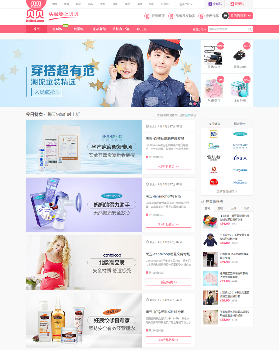 贝贝网以品牌正品、独家折扣、限时抢购为特色,主要提供童装、童鞋、玩具、用品等商品的特卖服务,产品适用于0—12岁的婴童以及生产前后的妈妈们。贝贝网专注于妈妈群体的服务,致力于整合国内外最优质的孕婴童品牌供应商,打造妈妈宝贝专属的一站式购物平台。